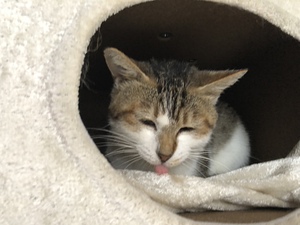 お店の庭で保護した可愛いキジ白ちゃん。お店の休憩室で保護してます。4歳ぐらいの女の子。避妊、ワクチン済猫エイズや伝染病など陰性。人馴れしてます。里親さん募集中です。お店で会えますのでお声かけ下さい。